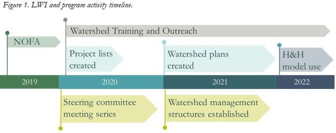 The LWI published their Notice of Federal Award (NOFA) on August 15th. This document was the first publication describing the LWI’s goals, objectives, requirements, timeline, etc. The document can be accessed here LWI NOFA. The primary goal of the LWI is “to enable a stable, long-term entity, or watershed coalition, that is capable of performing watershed region management activities aligned with the mission of the LWI.” Milestones are below